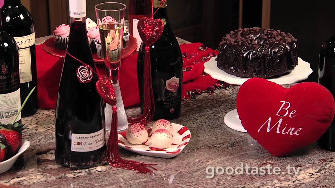 Here are a few romantic recommendations I’m sharing on Goodtaste.tv. A rule of thumb is you want your wine to be sweeter than the dessert it’s matched with. Champagne can work with chocolate, so long as the champagne is really sweet. And it does go nicely with strawberries if it’s not too dry…