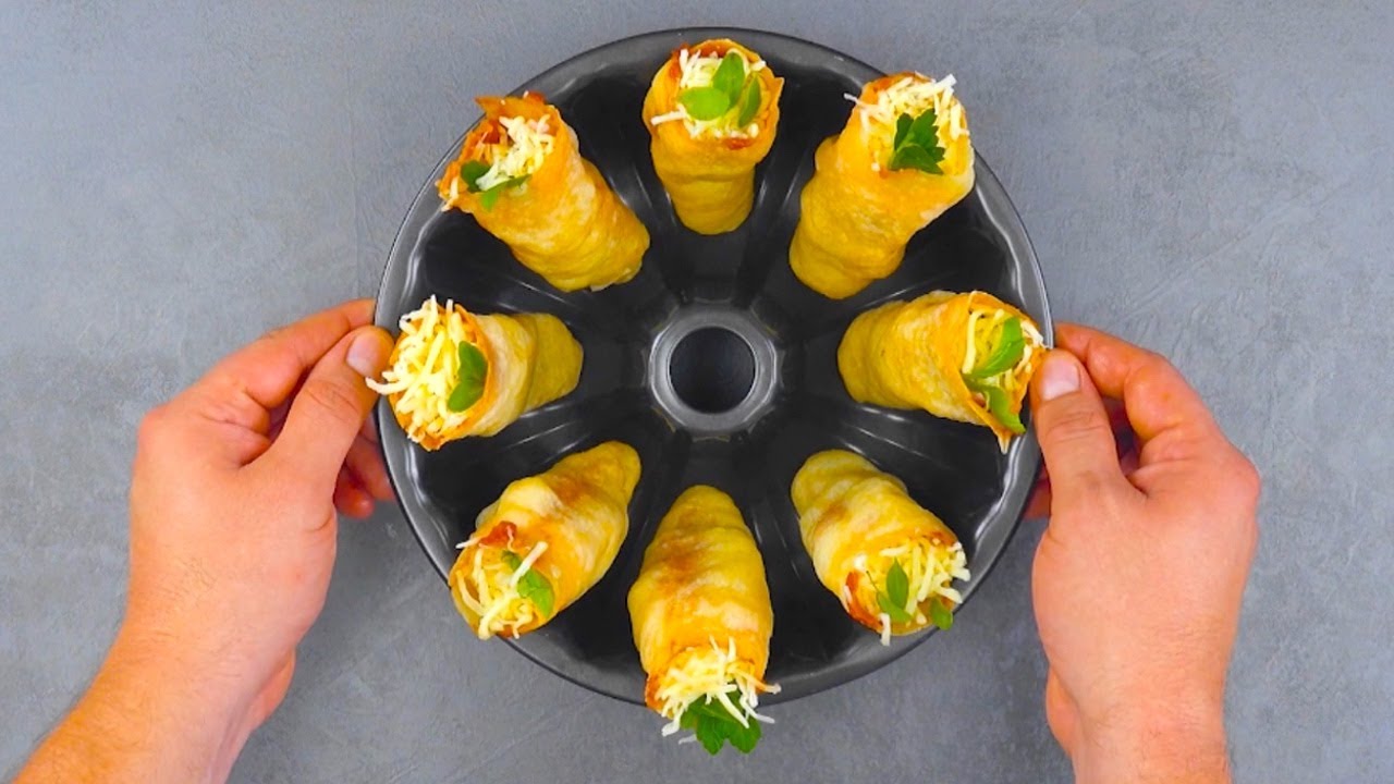 6. Place the filled pizza pockets upright in a bundt cake pan, transfer the bundt cake pan to the oven, and bake at 350°F for 10 minutes.