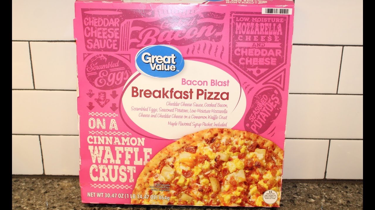 This is a taste test/review of the Great Value (Walmart) Bacon Blast Breakfast Pizza on a Cinnamon Waffle Crust. It has cheddar cheese sauce, cooked bacon, scrambled eggs, seasoned potatoes, low-moisture mozzarella cheese and cheddar cheese on a cinnamon waffle crust. There is a maple flavored syrup packet included. It was $6.47. 1/6 pizza (144g) = 370 calories
