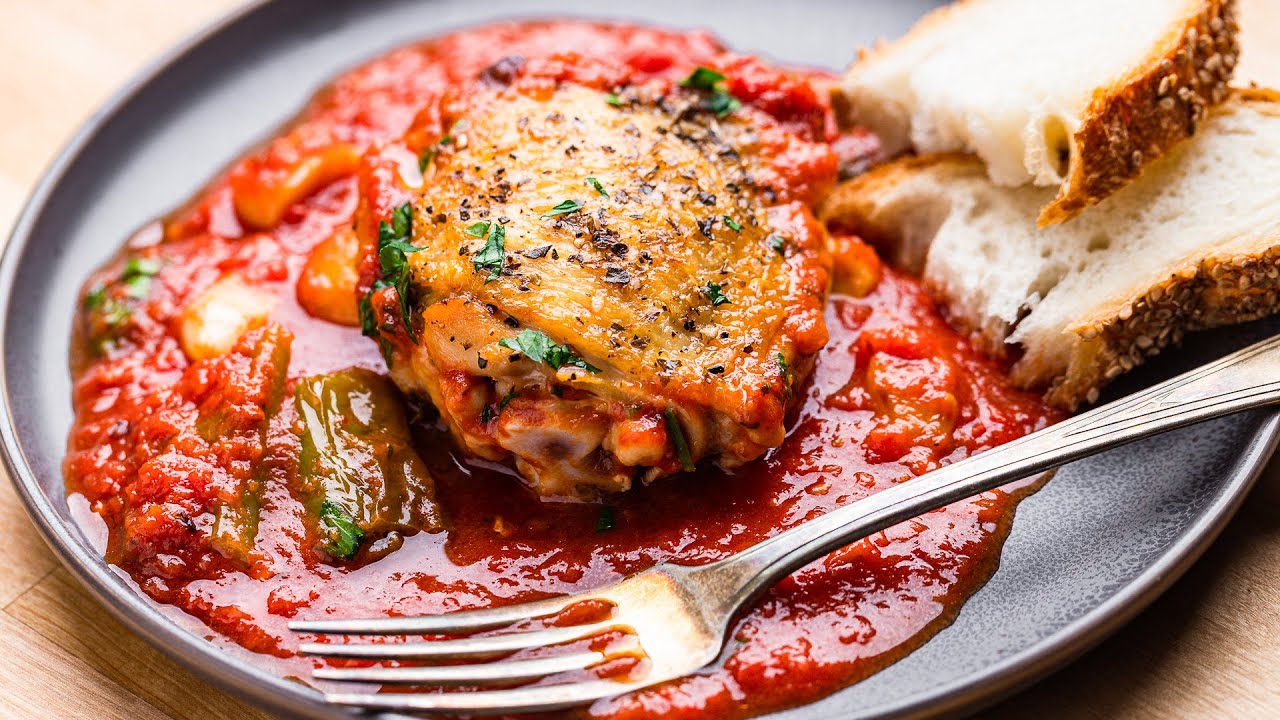 Today we’re making chicken far diavolo. It’s a twist on the very common shrimp fra diavolo recipe with the addition of long hot peppers and crispy chicken thighs. The full recipe for this spicy chicken dish is right below.