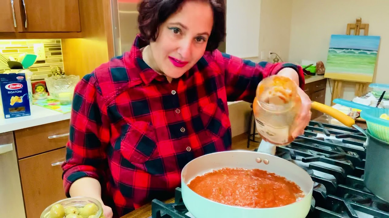 Heat 4 to 6 glasses of water, add salt and a spoon of olive oil. Add Rigatoni for 15 minutes. Heat some olive oil and minded garlic in a saucepan. Then add garlic pasta sauce, boiled rigatoni and olives. Add salt if needed. Mix well. Then add herbs like basil, oregano, lavender, rosemary, thyme and any other of your liking.