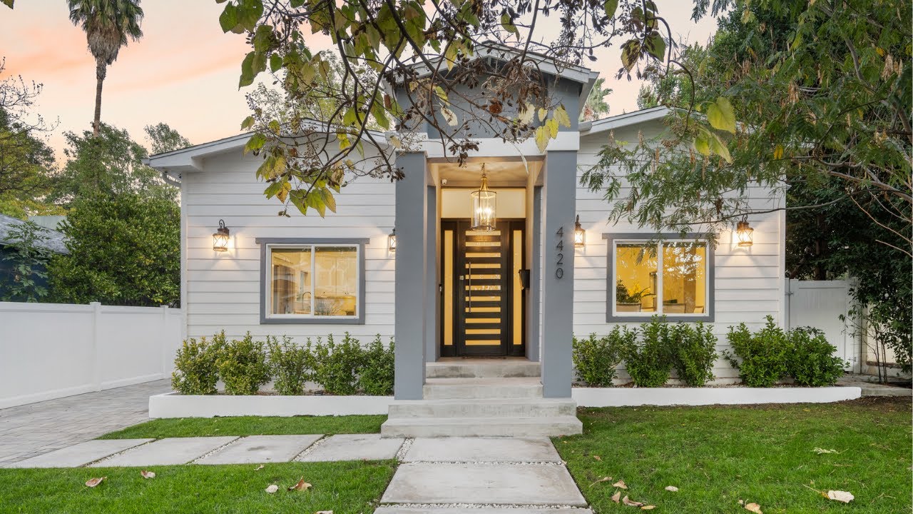 This gorgeous single-story home with a pool, spa, and permitted ADU, was completely updated in 2017. Nestled on a tranquil tree-lined street in Sherman Oaks, the elegant design, smooth stucco fence, and lush front yard welcome you into the home where you are greeted by a sweeping open floor plan, soaring vaulted ceilings, beautiful hardwood floors, in-ceiling speakers and LED-recessed lighting that fill the space with a light and cheerful ambiance. Designed to be bright and chic, this home is sure to impress! Curated for the enthusiast chef, the fully equipped kitchen offers a massive center island with breakfast counter, dry bar, stainless steel appliances, and abundant pantry and cabinet space for all your storage needs. Across from the kitchen is an expansive family room with a venetian plaster floor-to-ceiling fireplace that makes for a sleek and impressive focal point. The lovely dining area features a window overlooking the trees and greenery of the front yard. On the way to the bedrooms you pass a dedicated laundry room. The relaxing primary suite features modern barn doors, a sophisticated bathroom with dual-sink vanity, and walk-in shower. From the primary bedroom, large glass sliding doors lead out to the backyard and offer a relaxing view of the zen-like pool area. Ideal for entertainment, the private backyard features a sparkling pool & spa, built-in BBQ with fridge, bar-style counter, and outdoor speakers. The covered patio is great for lounging and al fresco dining! The backyard’s loquat tree and grape vine produce delicious loquats in the spring and grapes in the summer! In addition, you’ll find a permitted ADU equipped with a full kitchen, living room, bedroom, bathroom, Italian tile floors, and its own separate address! Just steps away from the new Whole Foods, dog park, Library Square, and the hottest shops and eateries on Ventura Blvd, this stunning home is a must see!