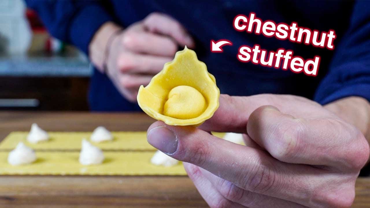 This Roasted Chestnut stuffed Cappellacci in a brown butter sauce is going to be the new hit this year with your family this holidays. Cappellacci is usually stuffed with zucca or squash, but sweet chestnuts are the perfect swap. Cappellacci also look like little elf hats so its the perfect pasta shape for Christmas.