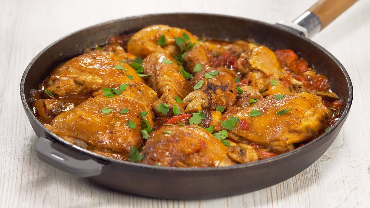 Chicken Cacciatore is a famous Italian dish of a chicken fried until golden crust and braised with tomatoes, mushroom and sweet pepper. One of legends says that wives cooked a chicken in the way a wildfowl was cooked when hunters came home without a gain. Hunter-style chicken is a perfect meal for a family or friendly dinner or as a main course for a festive one.