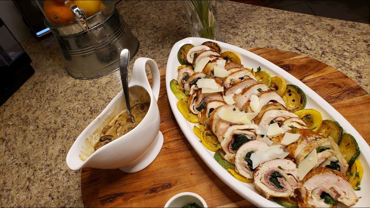 Chicken Rollatini w/ Spinach, Swiss, Prosciutto & Mushroom Cream