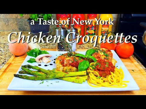 Tonight is a taste of New York City. We’re making chicken croquettes. Similar to chicken parmesan, these are made from fresh chicken breasts that are diced and made into patties with eggs, Parmesan Reggiano cheese and Italian breadcrumbs. Topped with a home-made tomato sauce made using San Marzano tomatoes and sprinkled with freshly grated mozzarella and Havarti cheese.