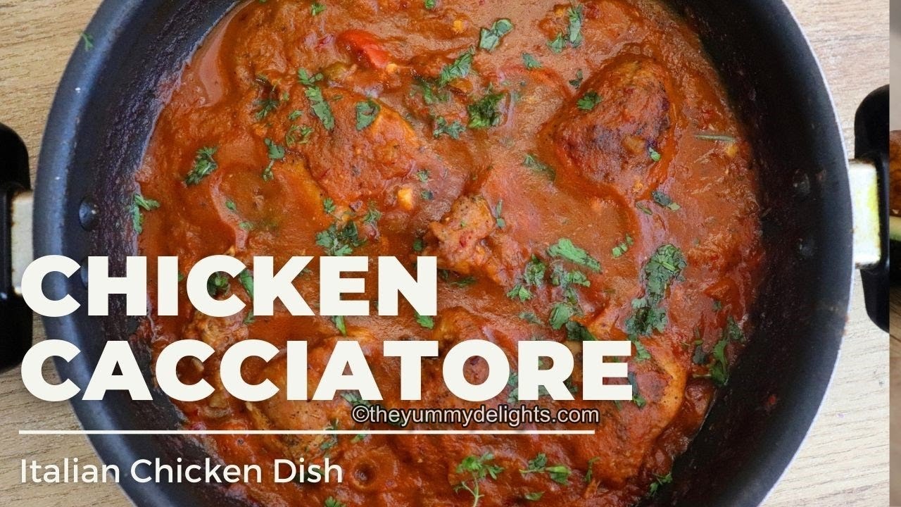 Cacciatore means “hunter” in Italian. It is a “hunter-style” meat prepared with onions, herbs, tomatoes, bell peppers, mushrooms, and sometimes wine.