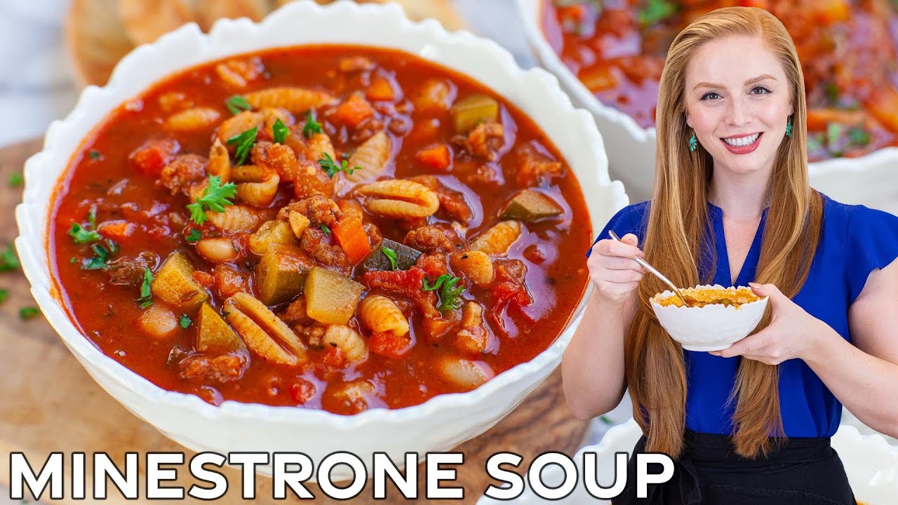 A hearty, warming and flavor-packed soup recipe! My classic Italian minestrone soup with Italian sausage is bound to become a family favorite! This one-pot, tomato-based soup is made with mini pasta and tons of veggies such as carrots, onions, zucchini and beans. You’ll find most minestrone soup recipes to be vegetarian, but I personally love to add mild Italian sausage to make the soup more hearty and even more flavorful! Serve it with grated parmesan cheese on top and toasted baguette on the side!