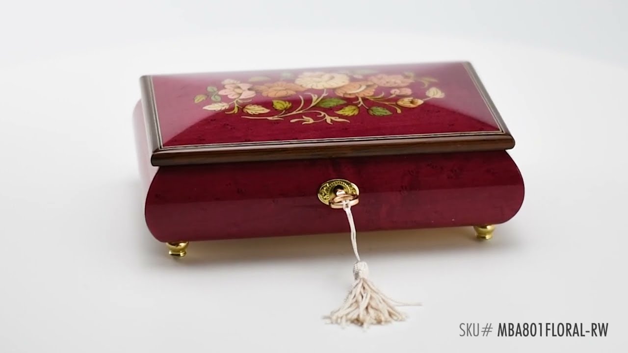 Beautiful 18 Note Red-Wine Floral Inlay Musical Jewelry Box with Lock and Key