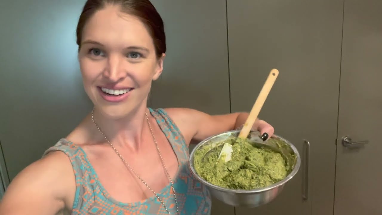 2. Add basil leaves roughly 1/2 cup at a time and grind until the basil leaves and pine nut paste combine to a creamy like consistency.