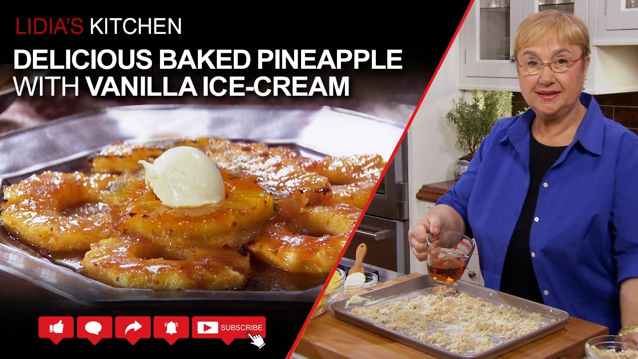 Delicious Baked Pineapple with Vanilla Ice-cream and Bourbon Syrup – This dessert tastes as great as it looks. In this episode, Lidia will show you how to make this delicious dessert.