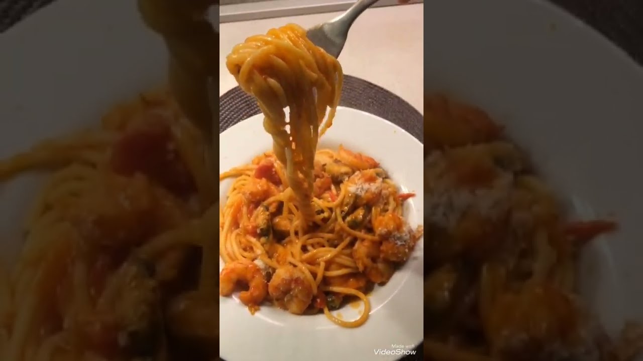 #mom’skitchen #spaghetti #italiankitchen #shorts #cookingspaghetti Spaghetti with mussels and prawns is a video demonstration. I made Italian spaghetti. Recipe: Doses for 4 people. 350 g of spaghetti, 200 g of mussels, 200 g of prawns, 1 onion, 2 cloves of garlic, 1/2 glass of dry white wine, 400 g of ripe tomatoes, olive oil, salt, pepper. Preparation: clean and chop the garlic and onion and fry them in oil. Add the shelled mussels and prawns. After a few minutes wet everything with the wine and let it evaporate. Add seedless and chopped tomatoes, salt. Boil spaghetti and drain and add them to the sauce and continue for a few minutes to cook everything together …. if it is dry, add the cooking water. Enjoy with me my new video Delicious Spaghetti with mussels and prawns.