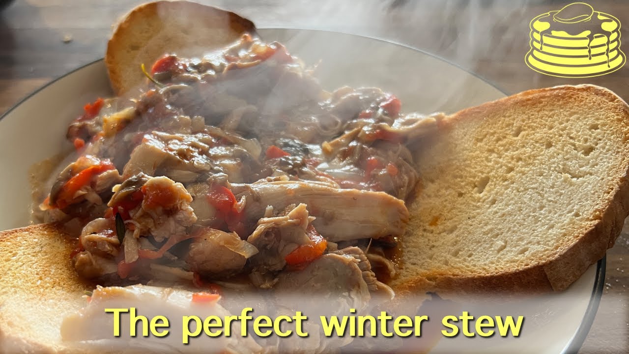 6. Cover and transfer to oven for 90 minutes. Discard herb sprigs and bay leaf. Shred the chicken and add it back to the pot. Discard the skin and bones. Return to the stove top over medium heat and bring to simmer. Reduce until you reach your desired consistency; the cacciatore in the video was reduced for about fifteen minutes. Skim any excess fat off the top of the stew. Serve right away, garnishing with minced parsley if desired.