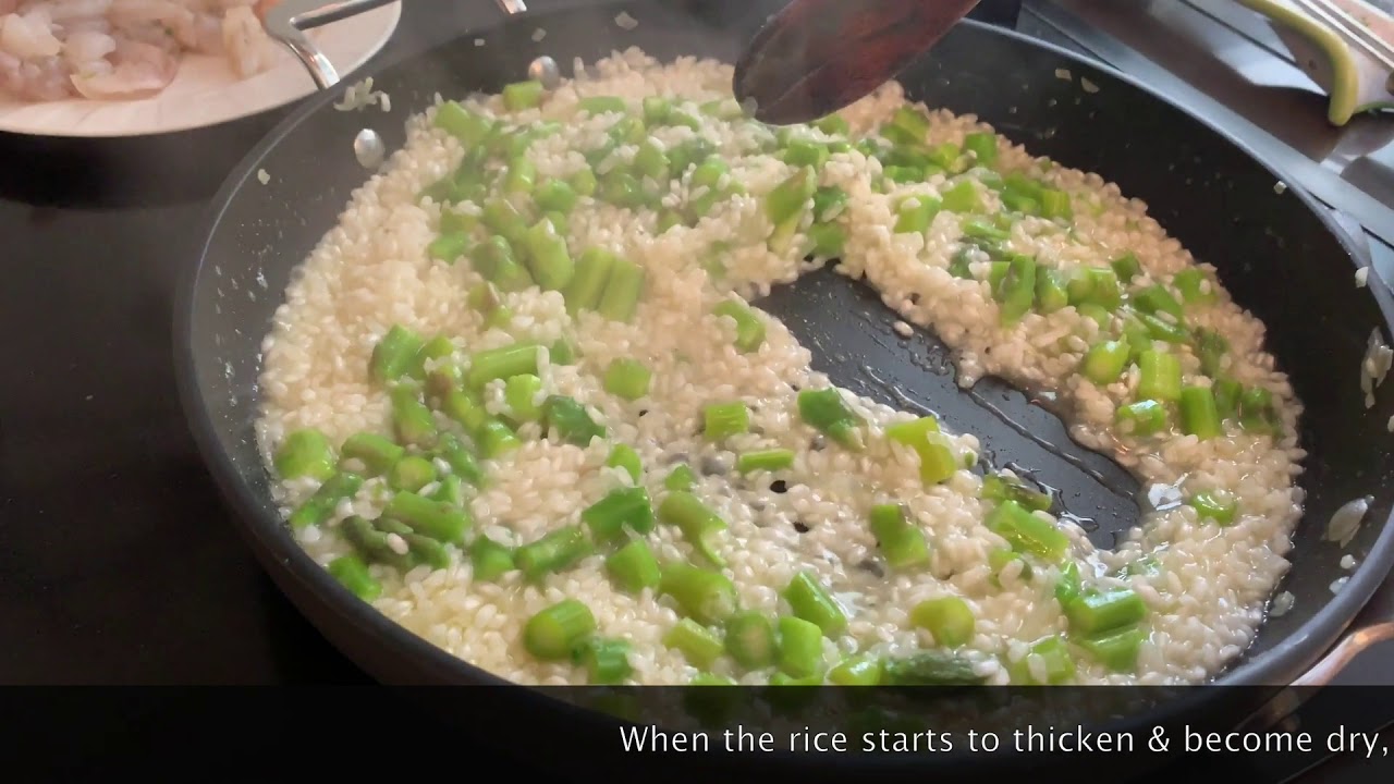 8. When you’re happy with the consistency of the rice (taste & see), add in the asparagus and then the shrimp.