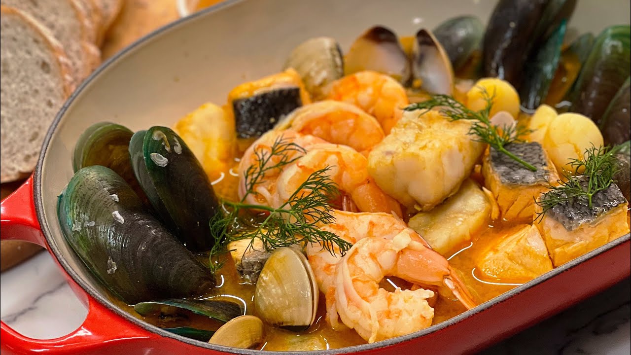 Seafood bouillabaisse. Making a fine dining dish at home that is great for serving guests or for special occasion.
