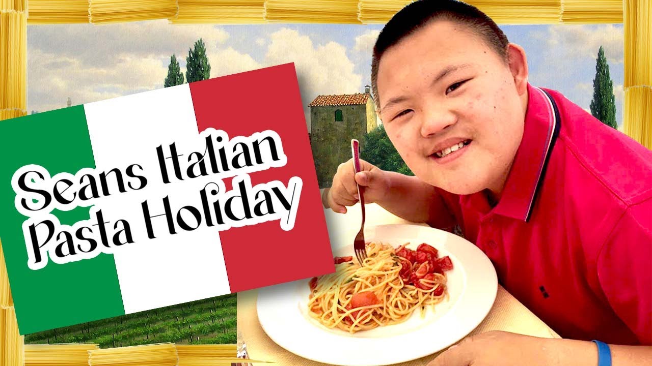 The boys watch a slideshow of Sean eating pasta in Italy, then tuck into a comically large bowl of pasta in front of a live audience.