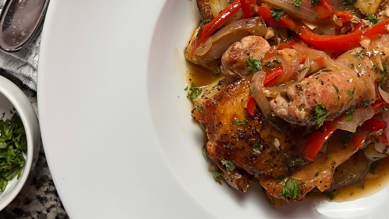 Serve with roasted potatoes or rice on the bottom of the plate followed by some of your delicious chicken scarpariello.