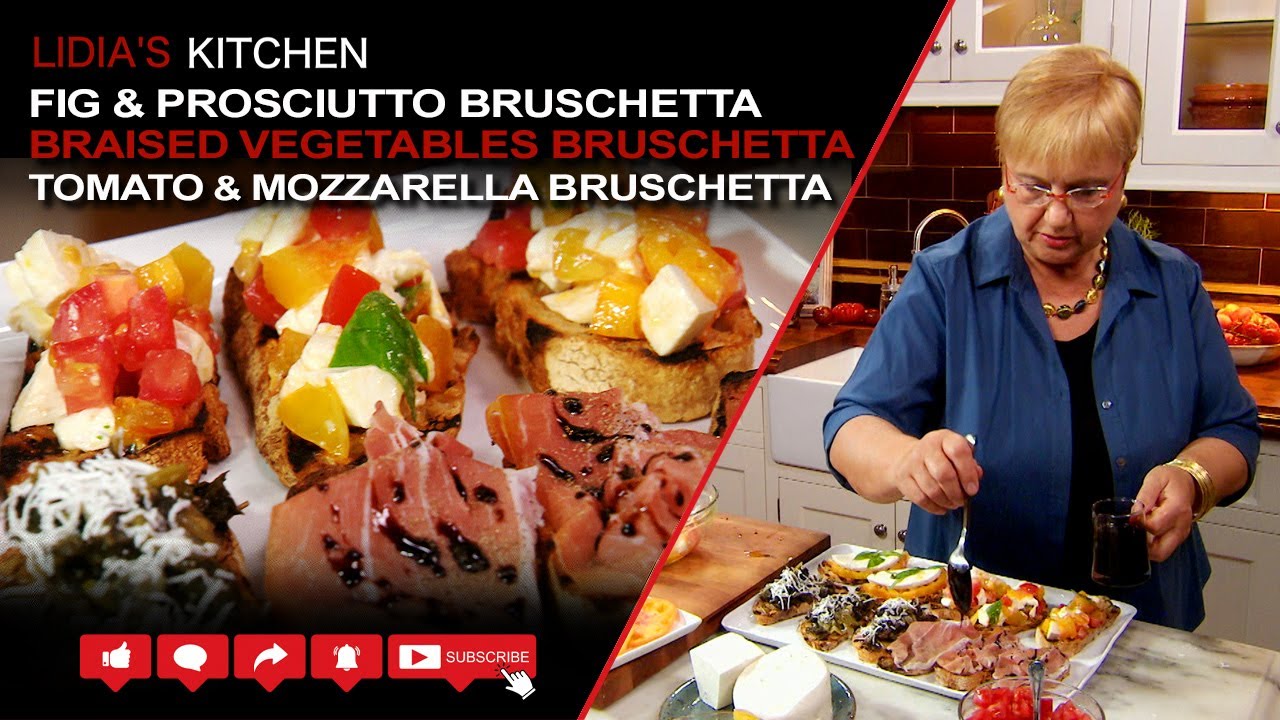 Fig & Prosciutto, Braised Vegetables, Tomato & Mozzarella Bruschetta Recipe – Lidia says that the key to a great party is always the food, and in this episode, Lidia features some of her best party recipes from over the years. Bruschetta is always a great snack to pass around, and the combinations are endless. In this episode Lidia is is showing us how to make: