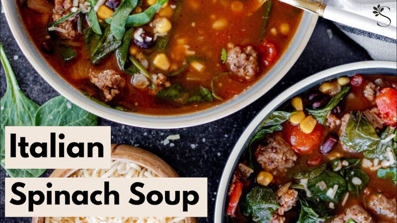 Italian Spinach Soup can be somewhat comparable to those familiar with Mexican Tortilla Soup—as it contains the beans, tomatoes, and corn ingredients—but what really distinguishes this soup is the spicy Italian sausage. It adds its own unique kick! It also has a great tomato base that is filling, but not heavy, because of the variety of broth, protein, and different types of veggies.