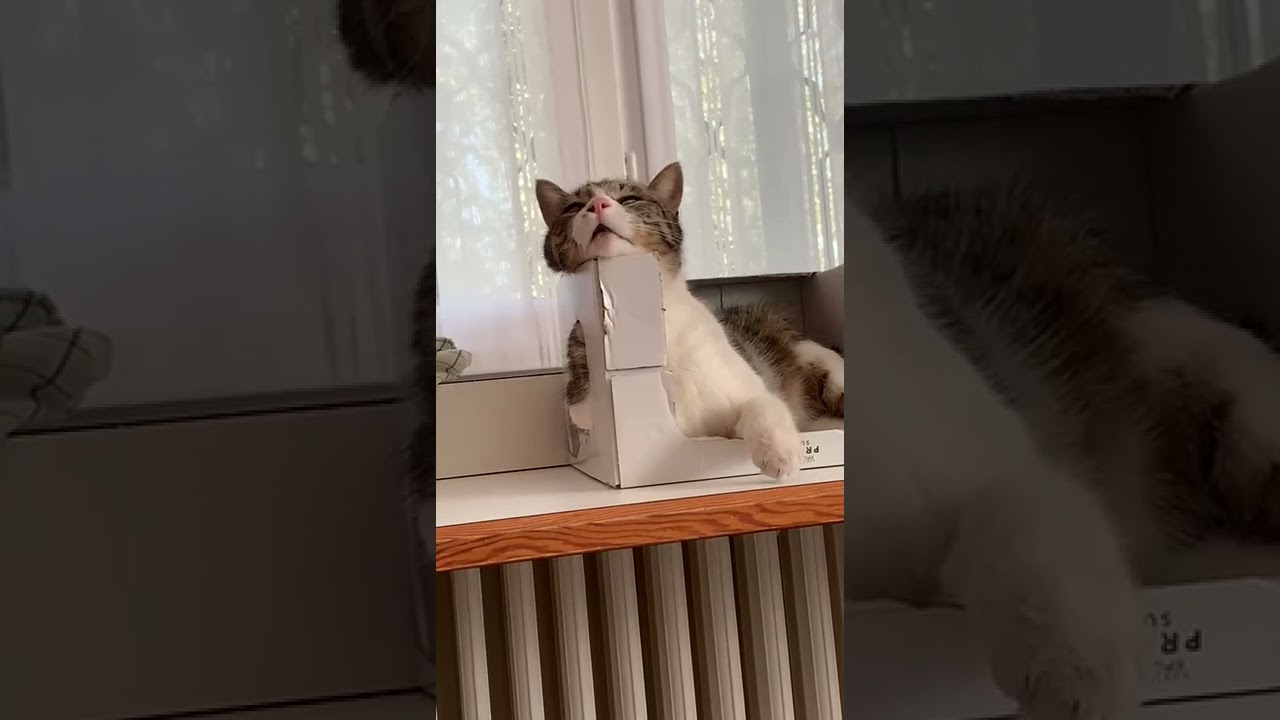 Cat resting and stretching in a wine box, Italy, March 2022.