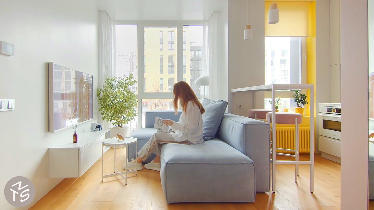 Located in the middle of the most densely populated district in Kyiv, Ukraine, Fayna town is a modern and vibrant residential complex built in place of a derelict vegetable factory and greenhouse. Inside one of the apartment blocks is the aptly named Pinkyellow, a bright and colourful space by Ukrainian designer Olga Bondar. Originally an empty shell, Bondar cleverly adjusted the floor plan, creating a compact, comfortable space using bespoke furniture and cleverly concealed rooms and appliances. In the open plan living space, a full size low back sofa was carefully selected for comfort and to reduce visual clutter, whilst a framed TV appears like artwork on the wall. In the compact but full kitchen, the fridge blends into the kitchen’s pink walls, and a small bar counter divides the kitchen from the living room; while also creating a work space. Behind a hidden door opposite the living room the bedroom features floating furniture and a custom made podium storage bed, whilst the dressing room lies neatly tucked away behind a curtain, allowing the client to open up the space or close it away to hide clutter.