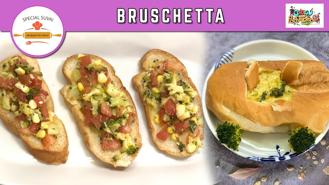 In this video, we are going to see how to make Bruschetta recipes in Tamil. It is a simple & tasty appetizer which everyone likes to eat. Bruschetta is an Italian dish that starts with a slice of Italian bread brushed with olive oil and grilled in the oven. We can top bruschetta with a wide range of ingredients such as chopped tomatoes, basil, onions, corn, broccoli, fresh mozzarella, olives, and so on.