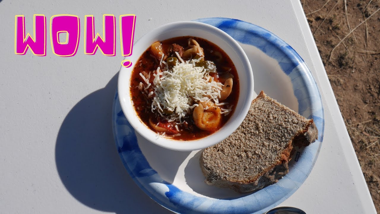 Brown the Italian sausage in a 12” Dutch oven over briquettes or coals. Crumbling with the back of a wooden spoon. Drain off grease as needed. Add onion and garlic to the Dutch oven sauteing until translucent. About 5 minutes. Add beef stock, tomatoes, tomato paste, zucchini, carrots, bell pepper, wine. Basil, and Oregano. Put lid on Dutch oven and simmer about 40 minutes. Then add the Tortellini cooking until tender.