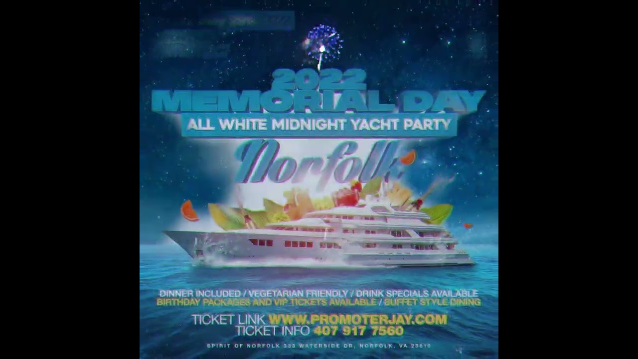 Turn Up this memorial Day on the Elizabeth River aboard the Spirit of Norfolk at our 2022 Memorial Day All White Midnight Yacht Party. All Aboard this 3 Level yacht with Panoramic Views of the city skyline. Enjoy Buffet Style Dining while viewing the skyline on the harbor. Bring out your special person or come alone. Enjoy Dancing with a Live DJ & Guest Host. Alcoholic Drinks are available for purchase. Tickets are now on sale.