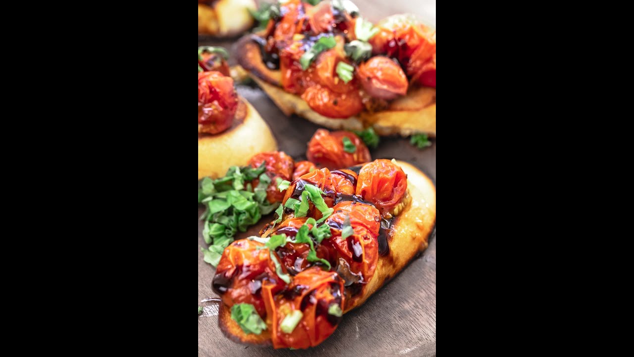 Bruschetta! Blistered sweet cherry tomatoes, fresh basil, and tangy balsamic glaze over crispy grilled bread. Ready in just 15 minutes!