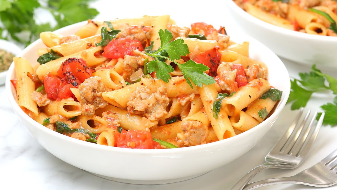If you’re looking for a quick and easy weeknight dinner recipe that is sure to please a crowd, you are going to love this recipe! Pasta is a weeknight staple in my house because it cooks up super quickly and my kids always love it! This version comes together in a single pot and is loaded up with flavor thanks to the addition of sausage, fire roasted tomatoes, and Italian seasoning!