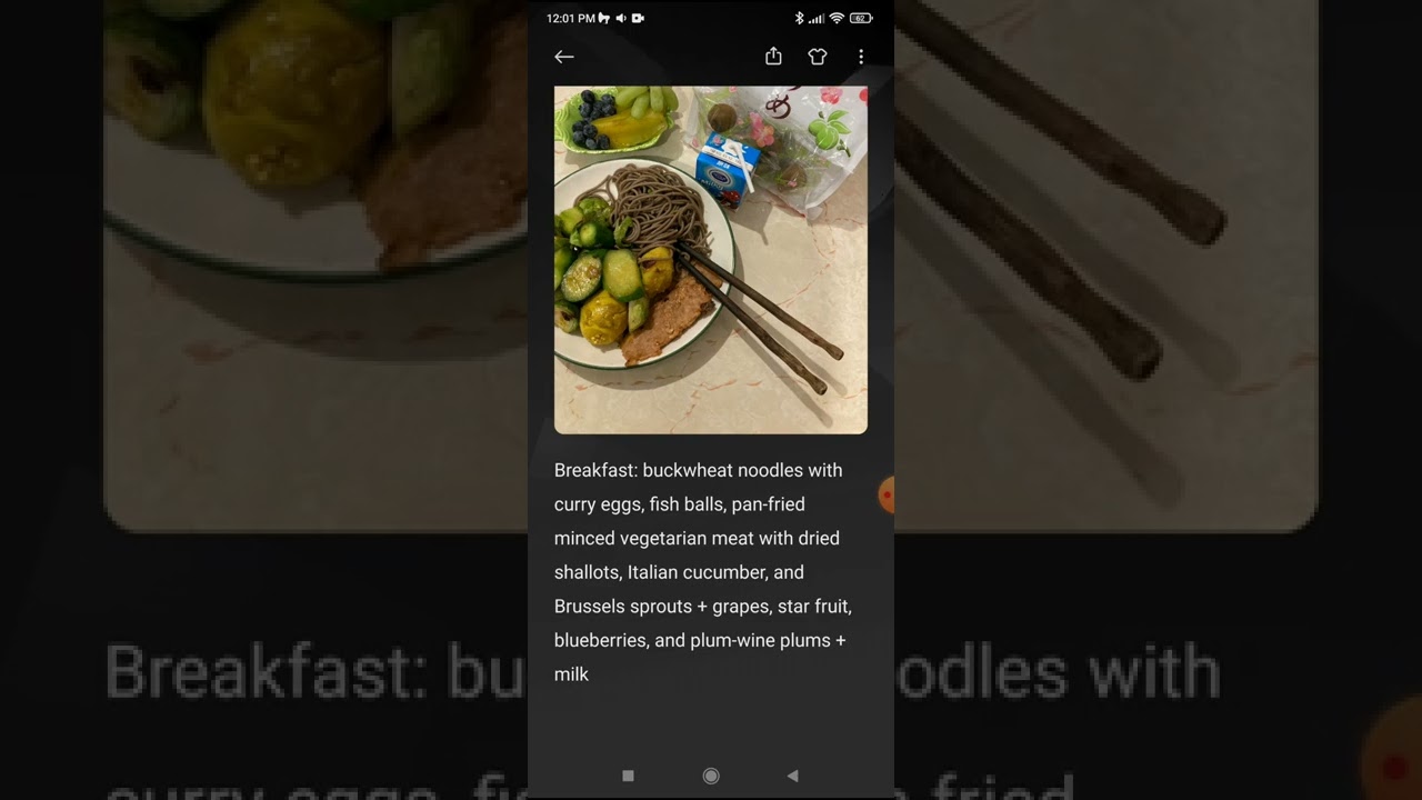 早餐:蕎麥麵 配 咖喱蛋、魚蛋、乾蔥頭煎免治植物肉、意大利青瓜,抱子甘蓝 + 葡萄、楊桃、藍莓、梅酒梅 + 牛奶 |
