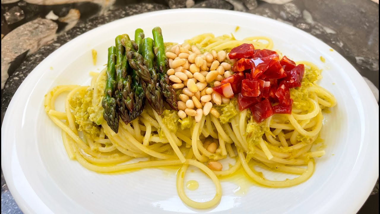 Green asparagus is an extremely healthy and tasty vegetable, typically available from March-June. Combined with some Italian flavors – extra virgin olive oil, pine nuts and topped with salamino not only it develops a rich taste, it looks spectacular and is rather easy to prepare – if you follow the steps described in this video recipe.