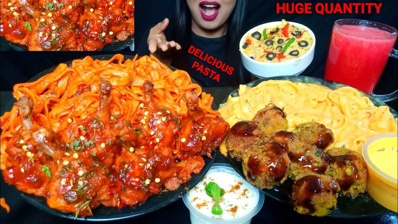 ASMR:SPICY CHILLI CHICKEN LOLIPOP,ITALIAN PASTA,POTATO BOLL,CREAM CHEESE&PERI PERI PASTA#hungrygirl