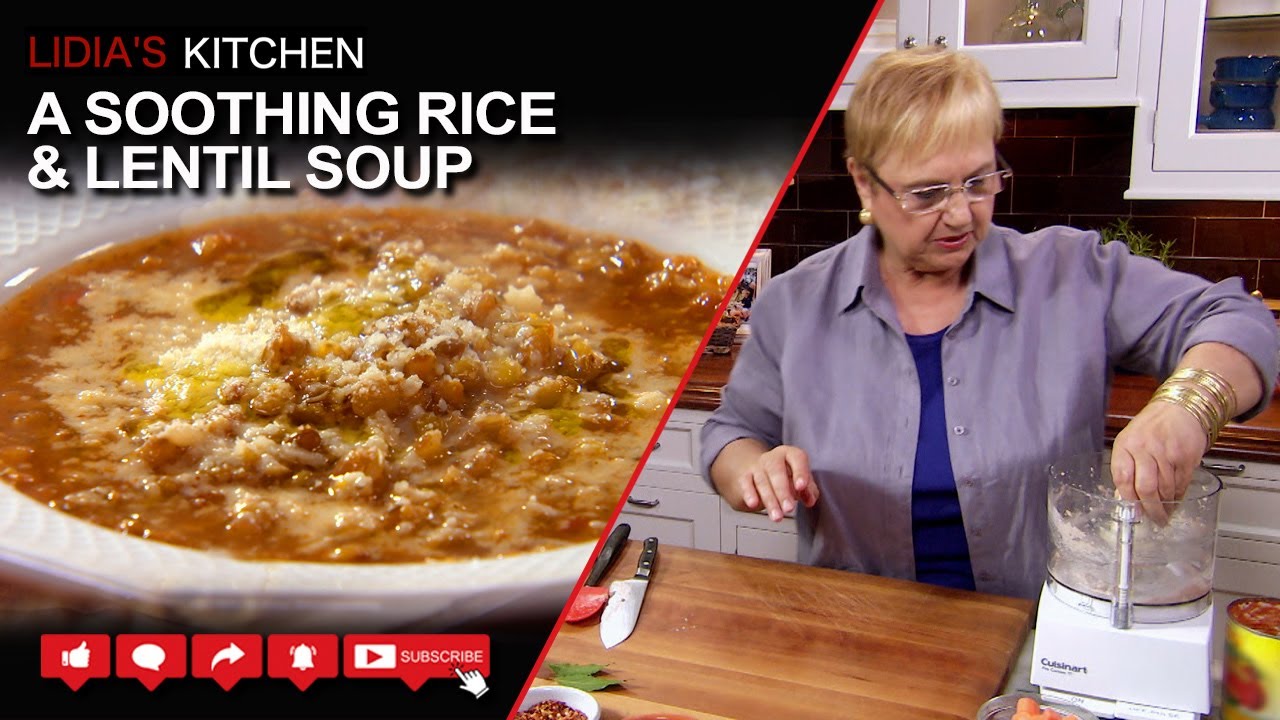Rice & Lentil Soup – Today, Lidia creates the ultimate heartwarming dinner table filled with dishes that deliver flavor, comfort and love in every bite. She starts with a soothing Rice and Lentil Soup topped with cheese and olive oil. Lidia also will show you the best way to complement the soup 😉 by adding extras to the table.