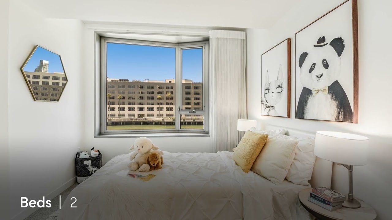 Welcome to your serene escape from the city, this chic two bed, plus den, two-bath home melds fine contemporary finishes with sweeping views of Mission Creek, Salesforce Tower, Oracle Park, The Bay Bridge, and Twin Peaks. Wide plank oak floors pave the living area while roomy walk-in closets provide ample storage. Custom Italian cabinetry and Caesarstone countertops surround high-end Gaggenau appliances. Central heat & air conditioning ensure year-round comfort.