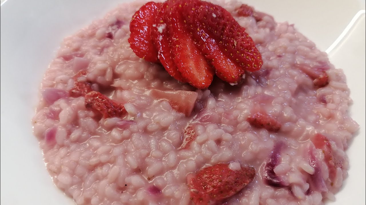 Hi all! To prepare one of the most delicious Italian risottos, you need a minimum of ingredients. I cook for 2 servings. Let’s start by peeling a small onion. You need to cut it into small cubes. Melt the butter in a frying pan and fry the onion in it. Add 200 grams of rice (arborio, carnaroli). Lightly fry the rice. Add 100 ml of dry white wine and let it evaporate. Gradually adding boiled water and stirring constantly, we prepare risotto in this way. The original recipe calls for this risotto to be cooked in vegetable broth. But personally, I like risotto cooked with water. You cook to your taste. Salt. 150 grams strawberries cut into cubes. When the rice is almost ready to eat, but it takes a few more minutes to fully cook, add the strawberries. If there is not enough liquid, then do not forget to pour water or broth. And stir constantly. When the risotto is ready, add 30 grams of grated parmesan and mix everything well. Strawberry risotto is ready. Bon appetit and thanks for watching.
