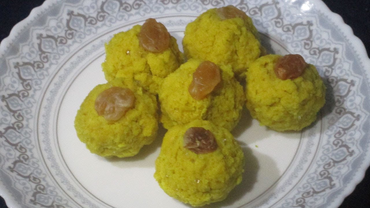 Take 100 g of Chickpea flour , 3 spoons of sugar, half a spoon of baking powder, a quarter spoon of turmeric powder and a quarter spoon of baking soda and mix well. Add 3/4 cup of water and mix well. Boil water in a pan. Put in a stand. Put in the cavity pan and pour in the batter which we prepared into the pan when the water boils. Close and let it cook for 15 minutes. After 15 minutes check whether the chickpea cakes are cooked properly by using a tooth pick . Take off the pan and cool and shred and coarsely grind the chickpea cakes to make a powder(This powder can be used as such or fried in clarified butter before the next step a per choice). Add some powdered sugar to the mixture and roll the mixture into balls. Put a raisin on top of each of the balls and serve.