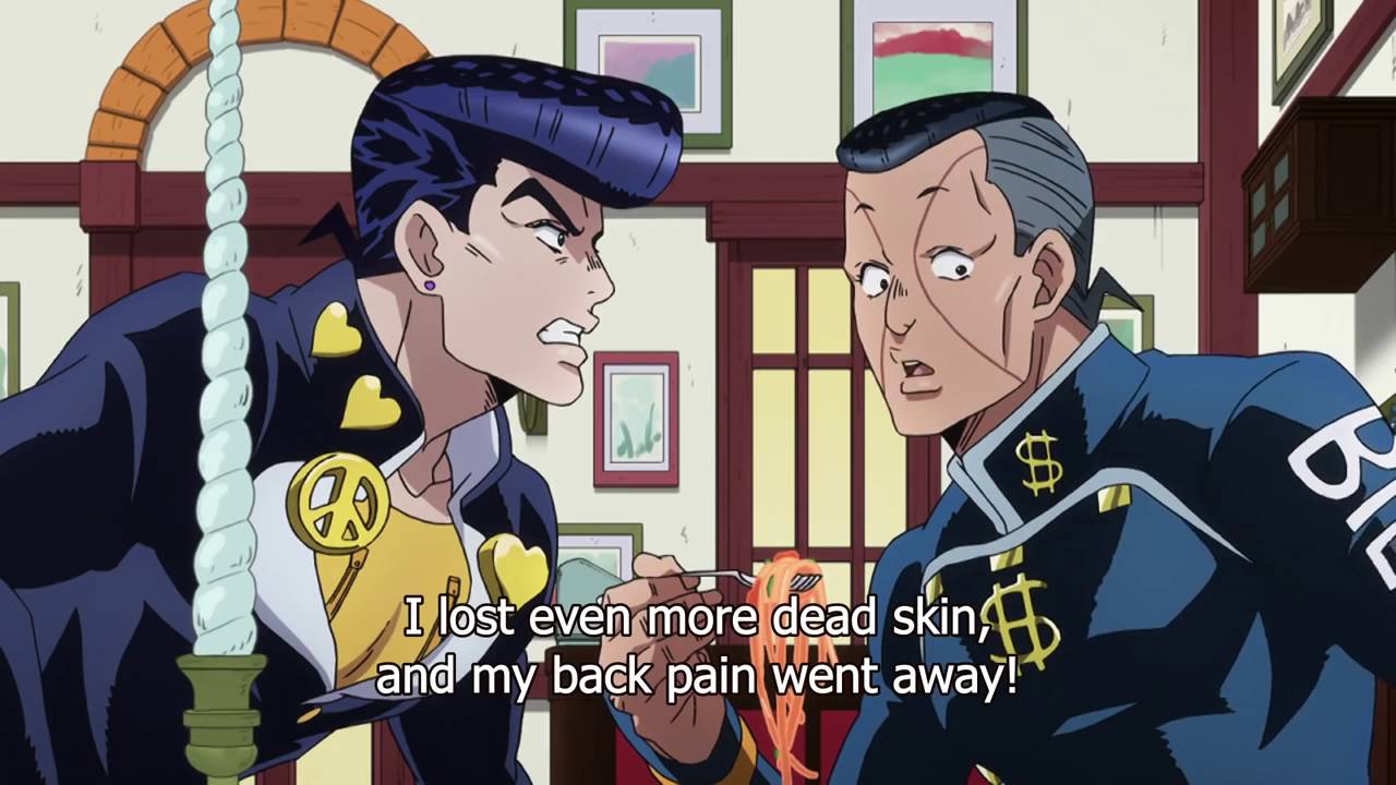 Okuyasu now eats yummy spaghetti, with a bit of a punch to it. SUPPORT THE OFFICIAL RELEASE! All rights of ジョジョの奇妙な冒険 ダイヤモンドは砕けない .