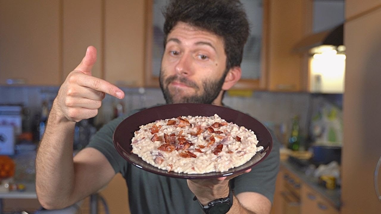 Only at the end add two thirds of the speck and now stop talking and let’s plate risotto. I’ve choosen a flat plate. Put a good amount of risotto in the center. After that take your plate and give it some knocks to the bottom.