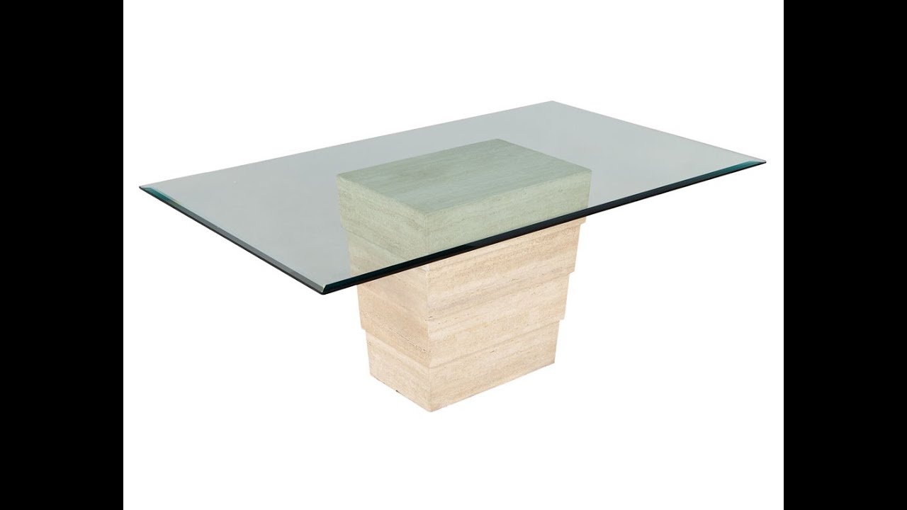 Vintage Italian Travertine marble base dining table with glass top. Original from Italy, circa 1980’s. Glass has wear consistent with age and use.
