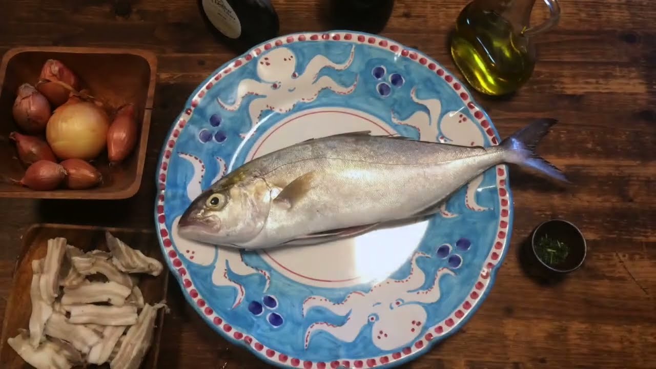 You need: fish according to availability and preference, shallots or other onions (that’s indeed how it’s written in the original text), garum fish sauce (I use colatura di alici; you can use Thai or Vietnamese fish sauce), olive oil, bacon, vinegar and savory (or other herbs to your liking).