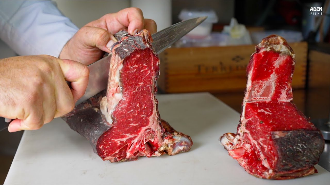 Chianina steak, morchelle, garlic talli, Black Cabbage, Cream of spinach