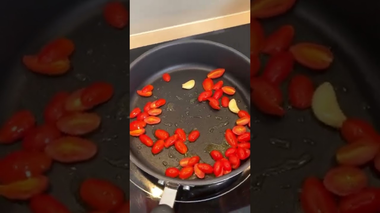 – take some oil, add garlic, cherry tomatoes, salt (optional), Chili flakes (optional), a tbs of cooking cream, and few spoons of pasta water.