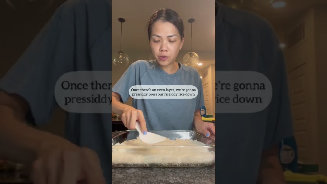 6. On a baking tray, add your rice and press it tightly into the tray. Add a generous layer of furikake. Top it off with your salmon/ crab mixture. Bake at 380 for 10 minutes, broil for 3-5 minutes (or until the top is nice and somewhat crusty)