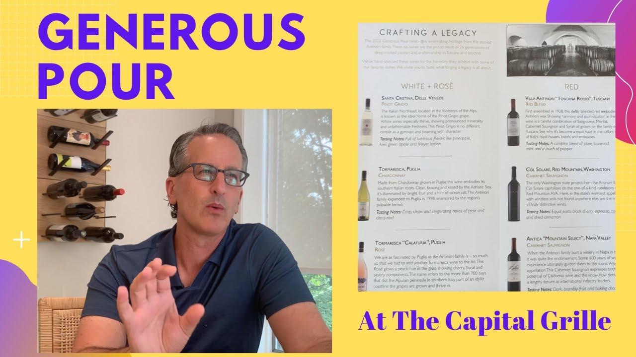 In this video I review the wines and our experience at the Generous Pour event at The Capital Grille. Each year they hold this event in the summer to drive some traffic and the value you get for the wine experience is truly incredible.
