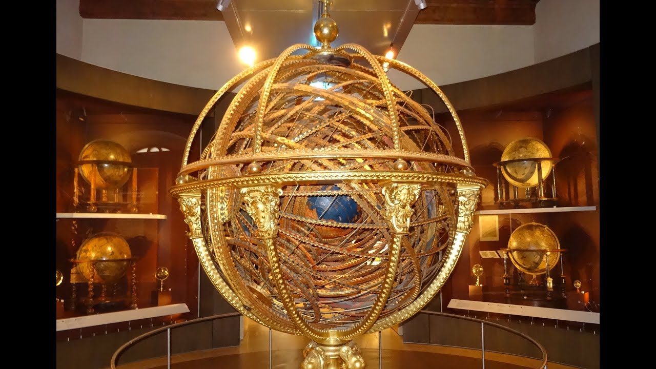 It also preserves a collection of instruments of the Accademia del Cimento , founded in 1657, with instruments for experiments on the thermodynamics, the void , the sound and the compressibility of liquids . One of the larger rooms contains a collection of antique globe and celestial spheres , with a great armillary sphere in carved and gilded wood used for complex astronomical calculations , made by Antonio Santucci between 1588 and 1593 .