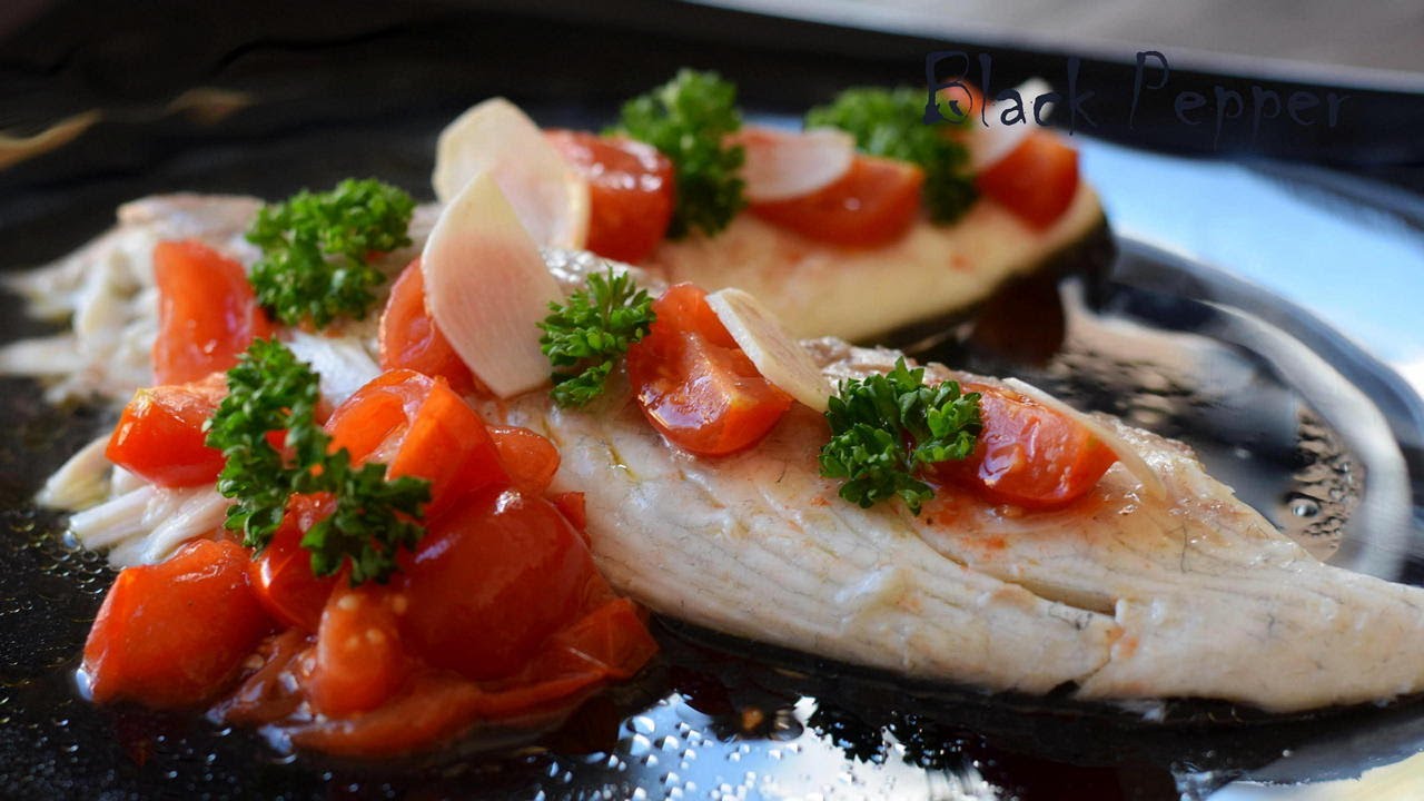 Pour the fish with white wine; add the water into the mold. Cut the tomatoes into four parts, put into form. Add garlic, salt, and pepper the sauce and fish. Put a few sprigs of parsley in the sauce.