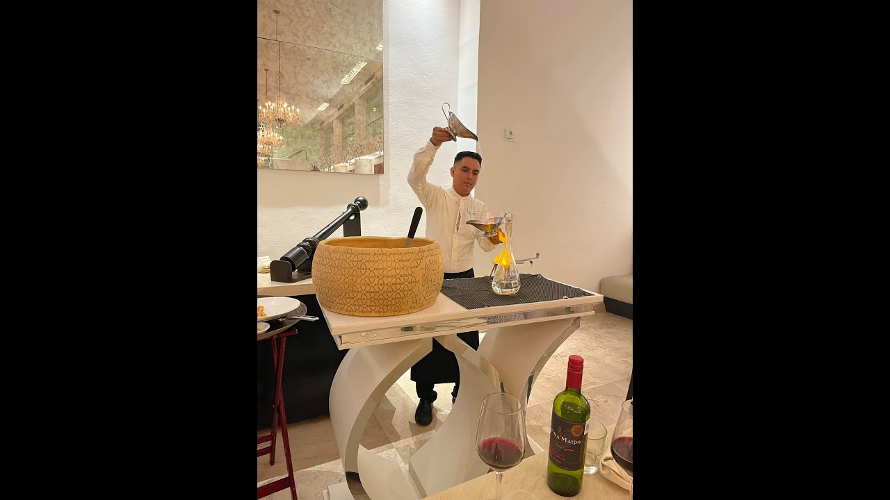 Checking into the Playacar Palace. Room included marble floors, an in room full sized jacuzzi tub, floor to ceiling windows with gorgeous Caribbean views, stocked liquors and mini bar, stone counters and light fixtures. Our first dinner – Italian restaurant with fine dining, flaming entrees, live piano, and top shelf after dinner drinks.