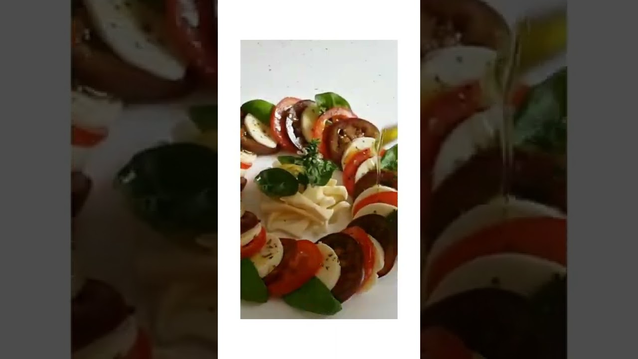 □ Le asezăm pe un platou alternând feliile de roşii cu cele de mozzarella şi frunzele de busuioc.