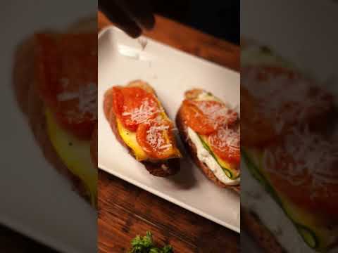 In focus- Our in-house toasted bread topped with homemade ricotta and fresh slices of zucchini, garnished generously with parmesan